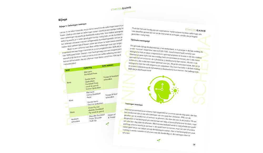 Ook staan er in het eBook drie voorbeeld schema’s waaraan je kan zien op welke manier je jouw schema opgebouwd. Wil je toch een extra hulp? Stuur een mail naar info@ethicalgains.nl en je wordt zo snel mogelijk geholpen!