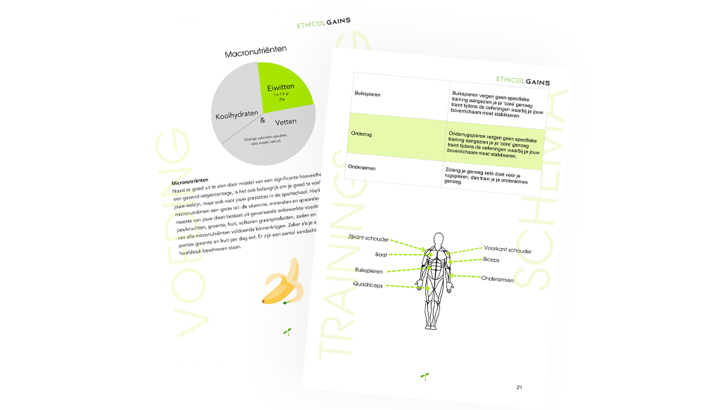 Ook staan er in het eBook drie voorbeeld schema’s waaraan je kan zien op welke manier je jouw schema opgebouwd. Wil je toch een extra hulp? Stuur een mail naar info@ethicalgains.nl en je wordt zo snel mogelijk geholpen!